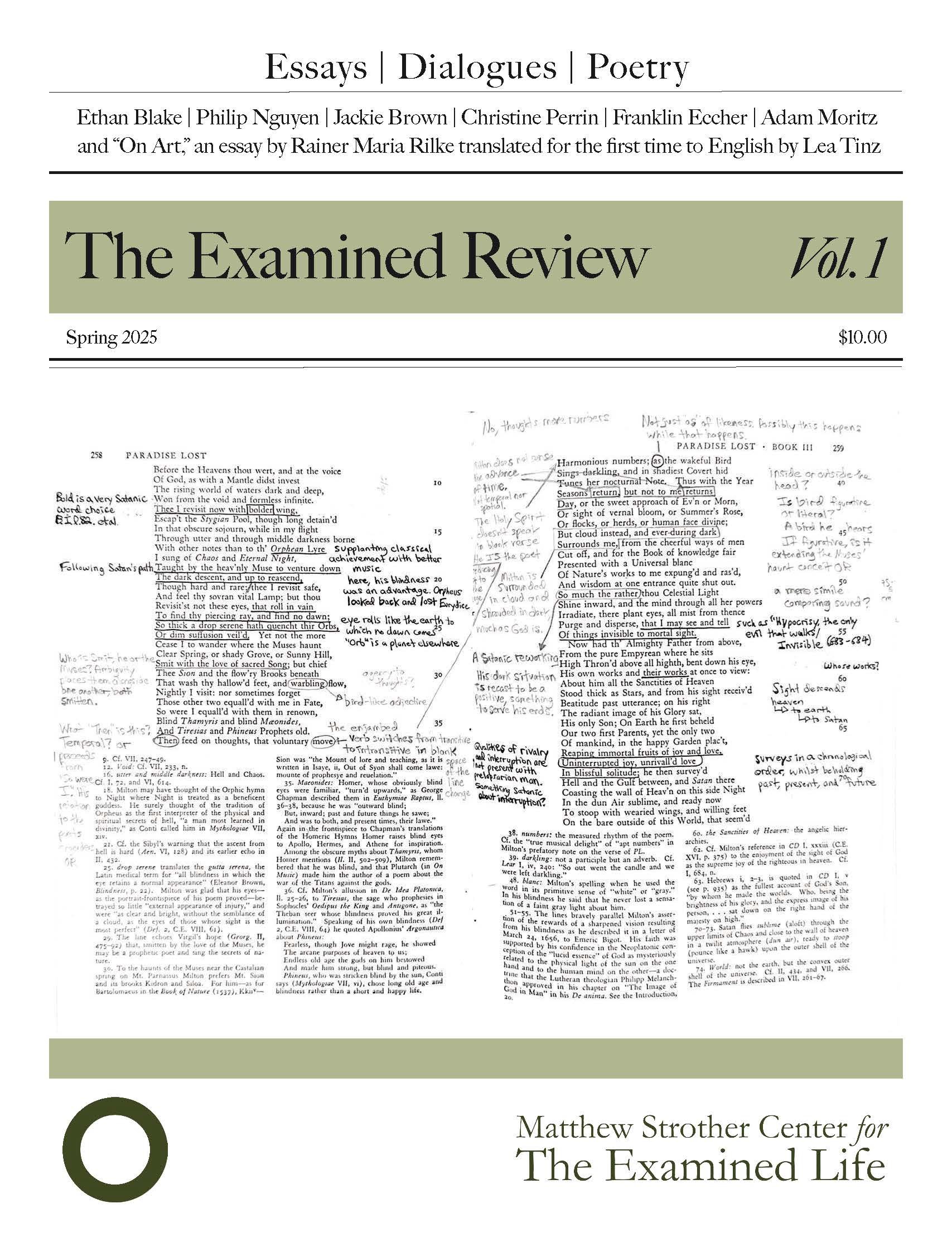 The Examined Review is a print-only publication featuring writing from those in and around the Matthew Strother Center, edited by Adam Moritz (‘24, FA ‘25). It was started as an attempt to give tangible form to the ongoing conversations which comprise the life-texture of the MSCEL. Included in its first issue were essays, poems, a dialogue, a crossword puzzle, and the first English translation of an early essay by Rainer Maria Rilke.